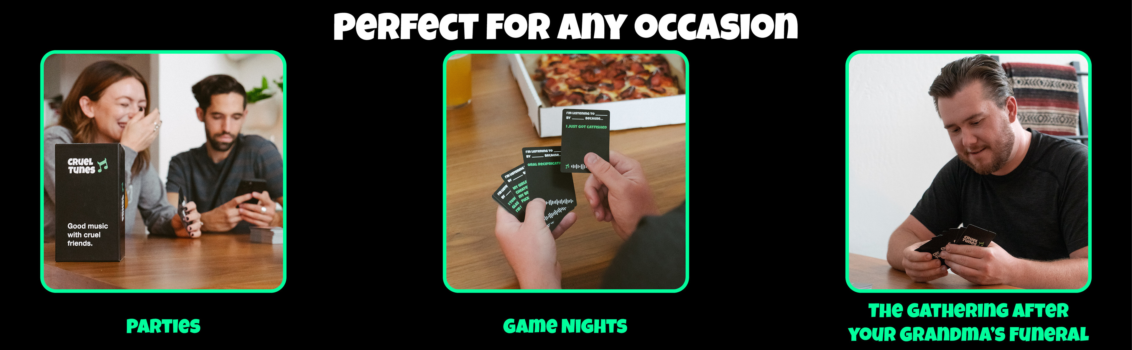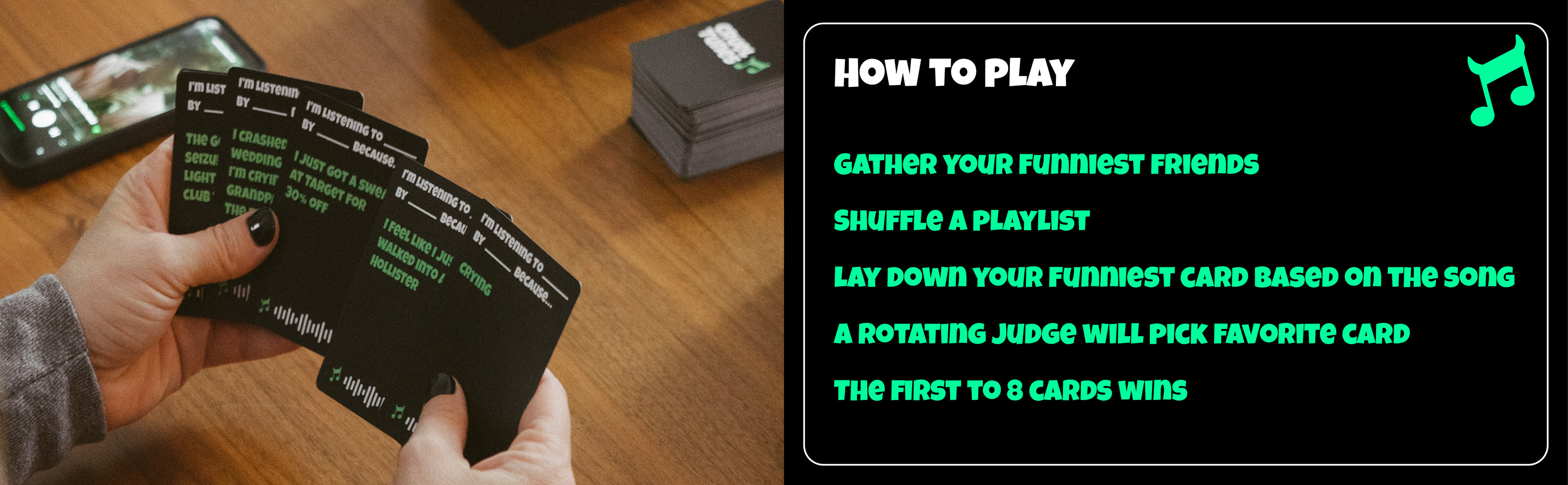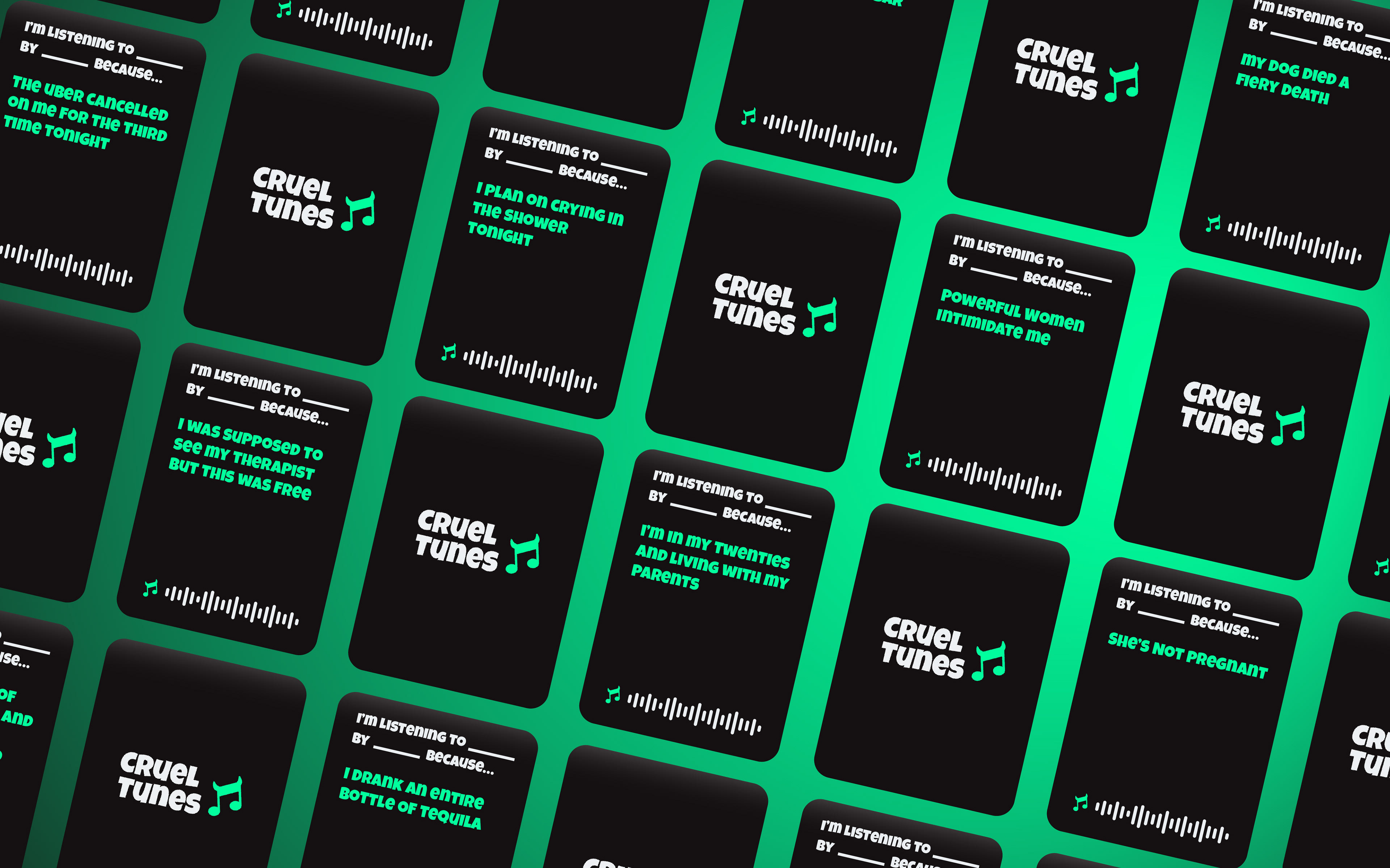 Cruel Tunes is an adult card game for music and comedy lovers, played similarly to Cards Against Humanity but with a musical twist. As a Social Media Intern, I created and posted daily photo and video content for Instagram and TikTok. Over the course of a year, my efforts boosted the company’s TikTok following by 150% with 727,000 total video views, and increased their Instagram following by 57%, reaching 2.7 million accounts. Below are some of the projects I did on Instagram, TikTok, and Amazon.
